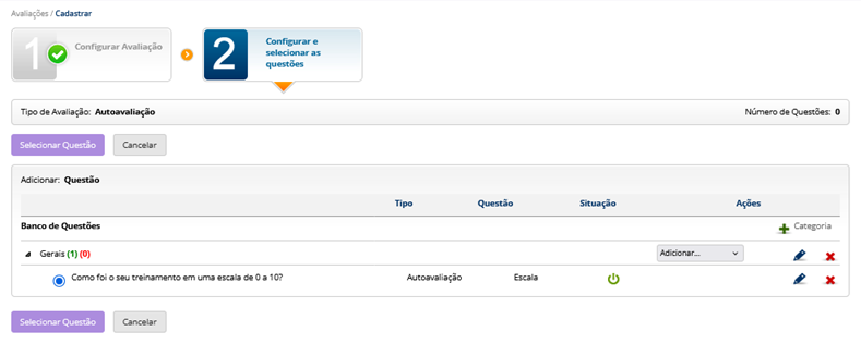 Serão exibidas todas as categorias cadastradas, porém apenas as questões do tipo “Autoavaliação” estarão disponíveis dentro dessas categorias.