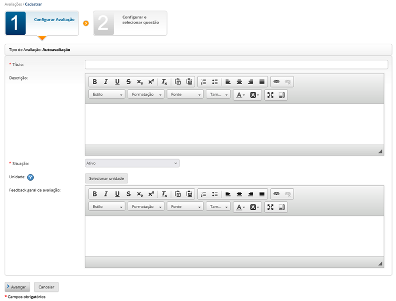 Lembrando que, nas avaliações do tipo “Autoavaliação”, é permitido incluir apenas uma questão.