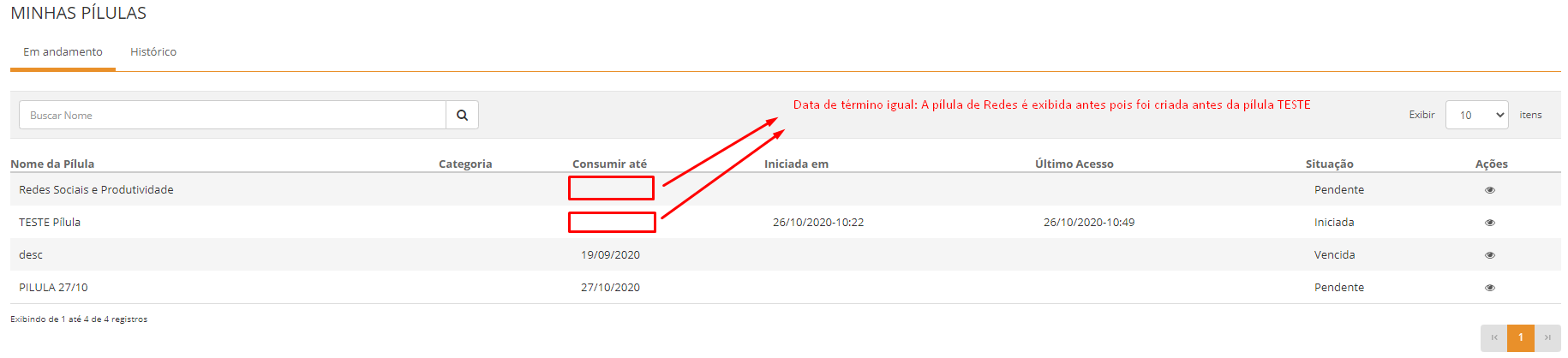 A ordenação é pela data final de consumo (Coluna: Consumir até). Caso esta data seja igual em duas pílulas, o segundo critério é a data de criação da pílula. Abaixo um cenário de exemplo: