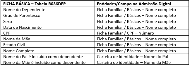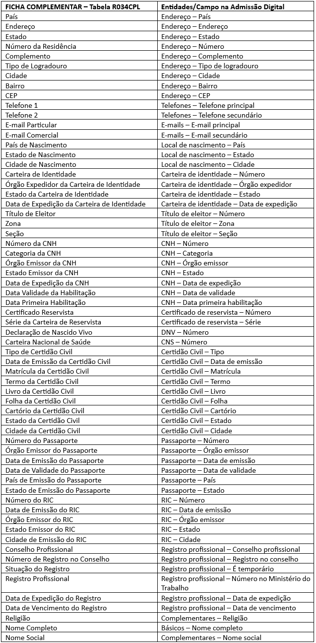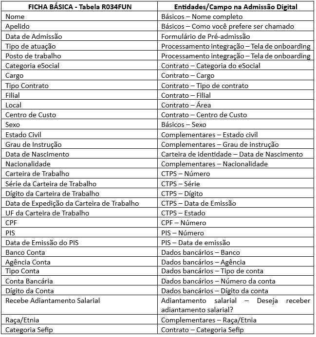 Hoje ao todo existem 105 campos nativos que integram entre os produtos Admissão Digital x Administração de Pessoal conforme as tabelas abaixo: