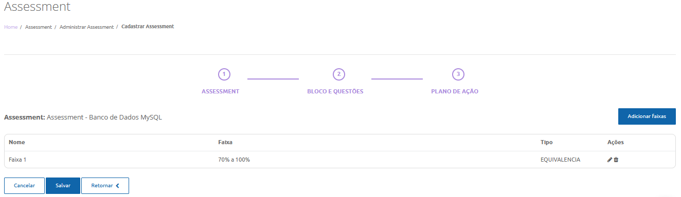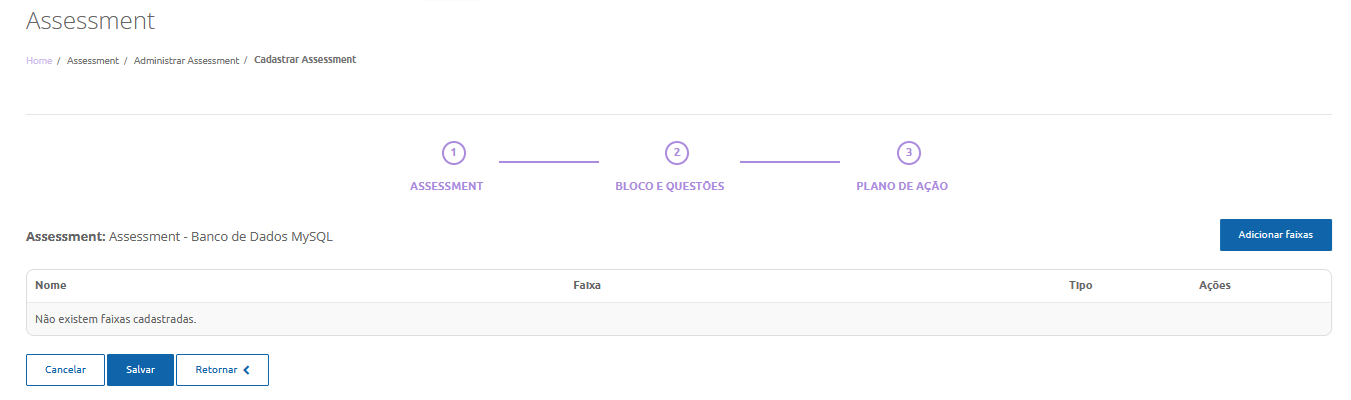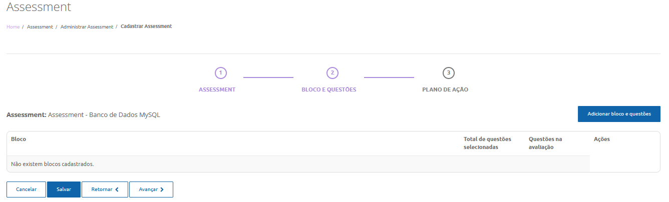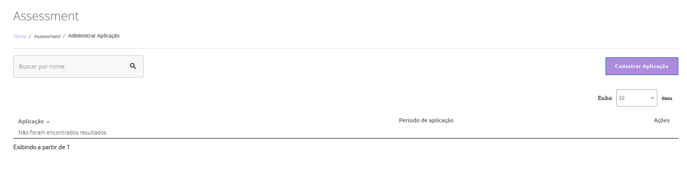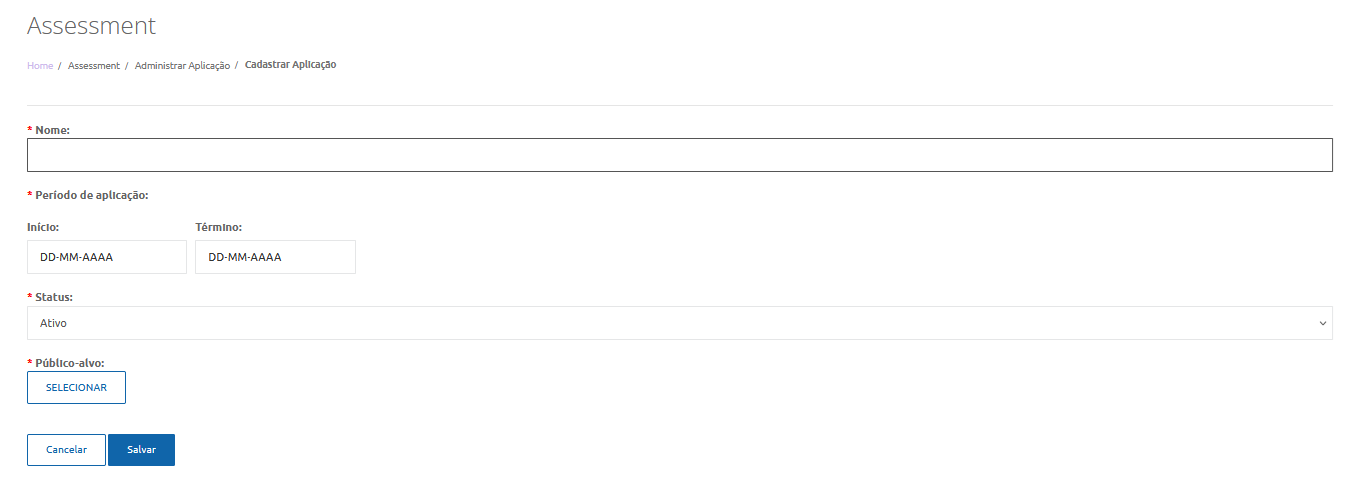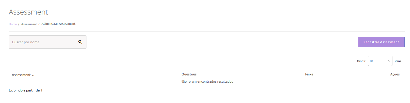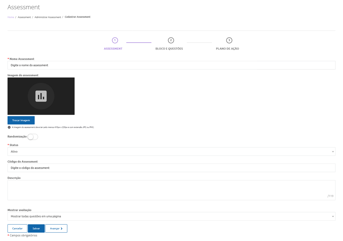 Para cadastrar um novo Assessment, acesse o menu Assessment > Administrar Assessment e clique no botão Cadastrar Assessment.