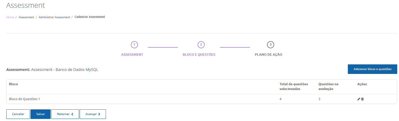 Agora você deverá criar os blocos e definir as questões que os alunos deverão responder no assessment.