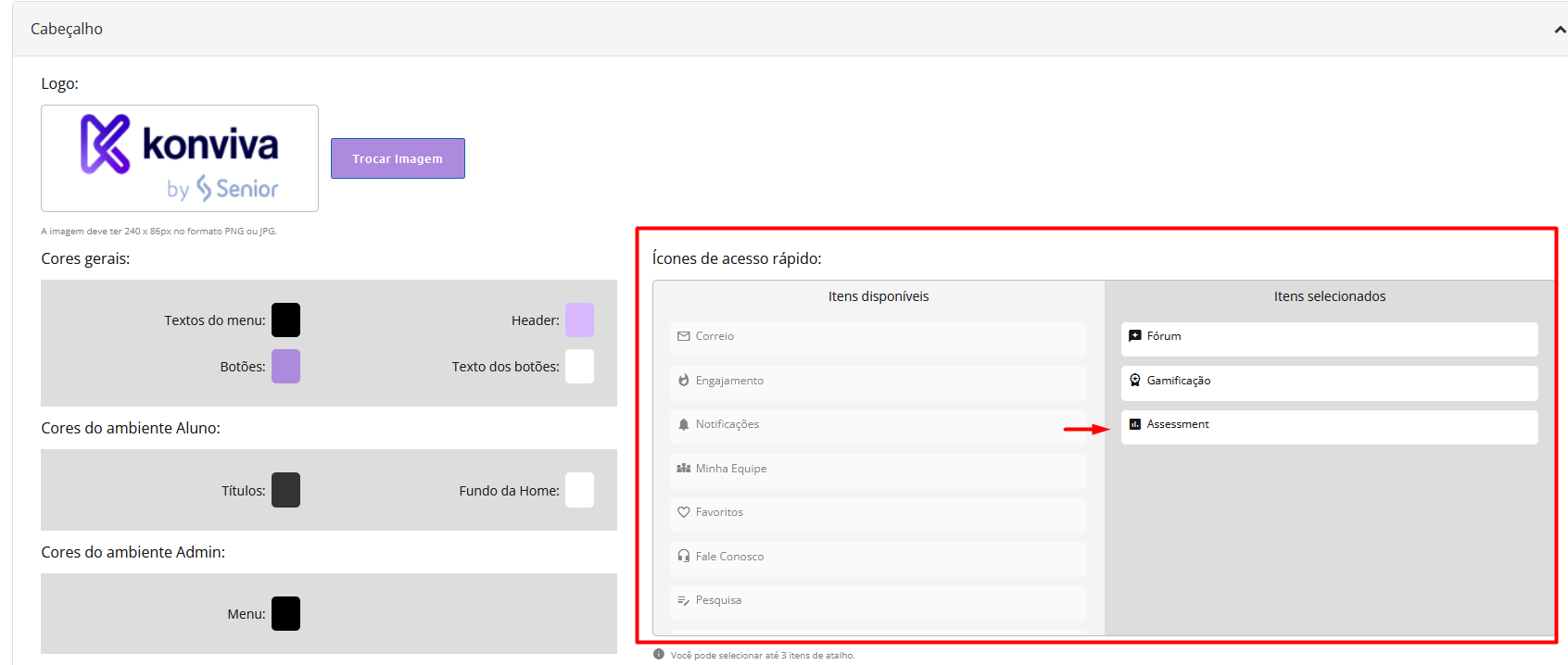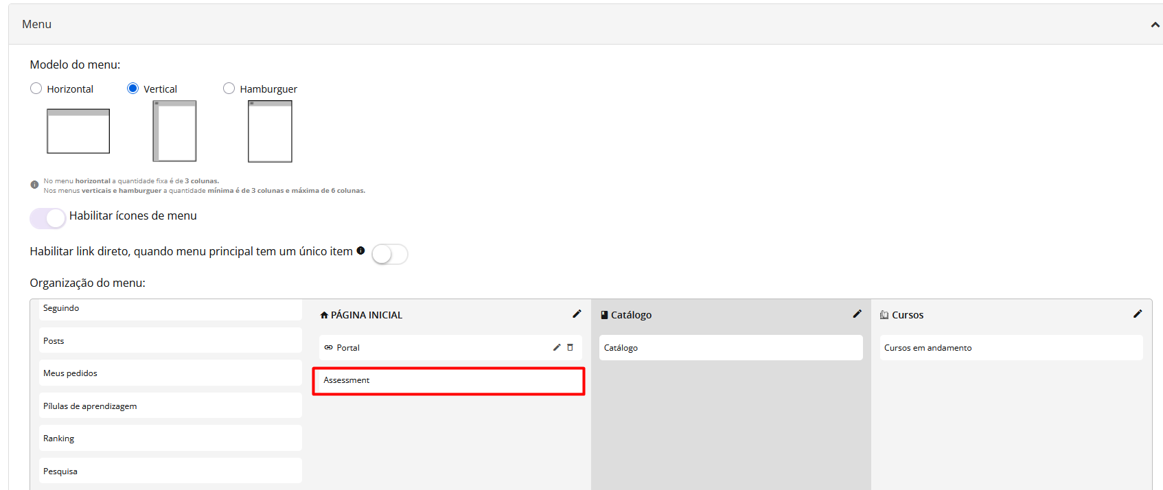 Nas Configurações de Layout (menu: Configurações > Layout > Interface Web, guia Configurações de Interface), você poderá adicionar o item “Assessment” ao cabeçalho, conforme ilustrado na imagem: