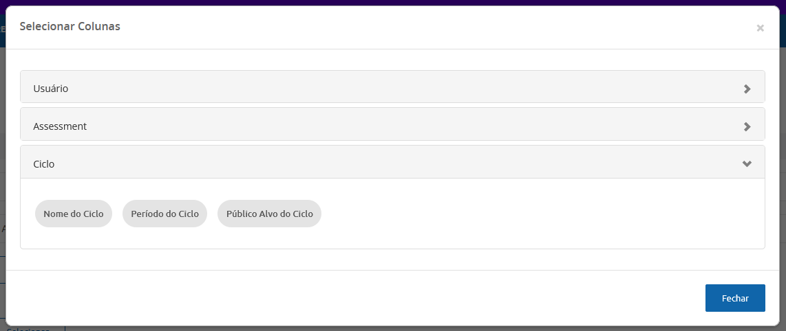 Período do Ciclo: o intervalo de datas definido para a aplicação do assessment.