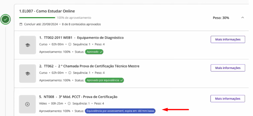 c. ao ganhar equivalência temporária, a trilha passa a exibir o chip de “equivalência por assessment, expira em dd/mm/aaaa”.