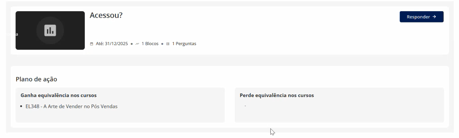 O aluno visualizará os assessments que precisa responder. Ao clicar no botão "Mais informações", será direcionado para a página que exibe o plano de ação configurado, mostrando as equivalências que ele poderá ganhar e as equivalências que ele poderá perder.