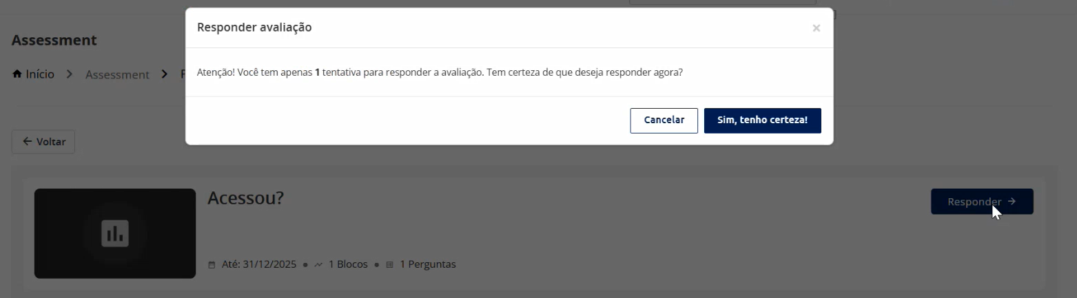 Ao clicar em "Sim, tenho certeza" o aluno conseguirá realizar o assessment: