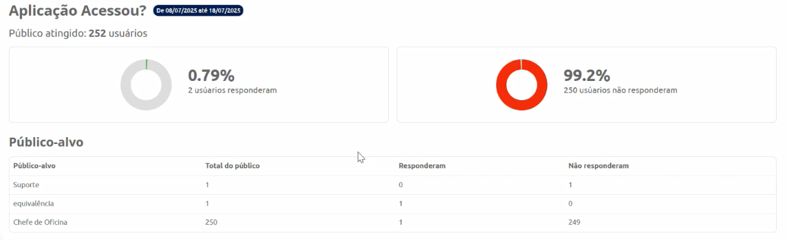 No Dashboard, você terá uma visão completa do público atingido, incluindo a porcentagem de usuários que responderam e os que ainda não responderam o assessment.