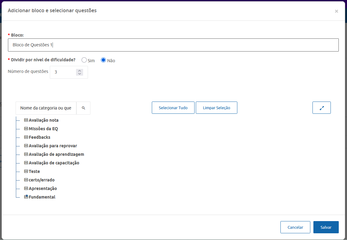 Nesta tela, você deverá inserir o nome do bloco, definir se deseja ou não dividir por nível de dificuldade e informar a quantidade de questões, de acordo com o banco de questões selecionado.