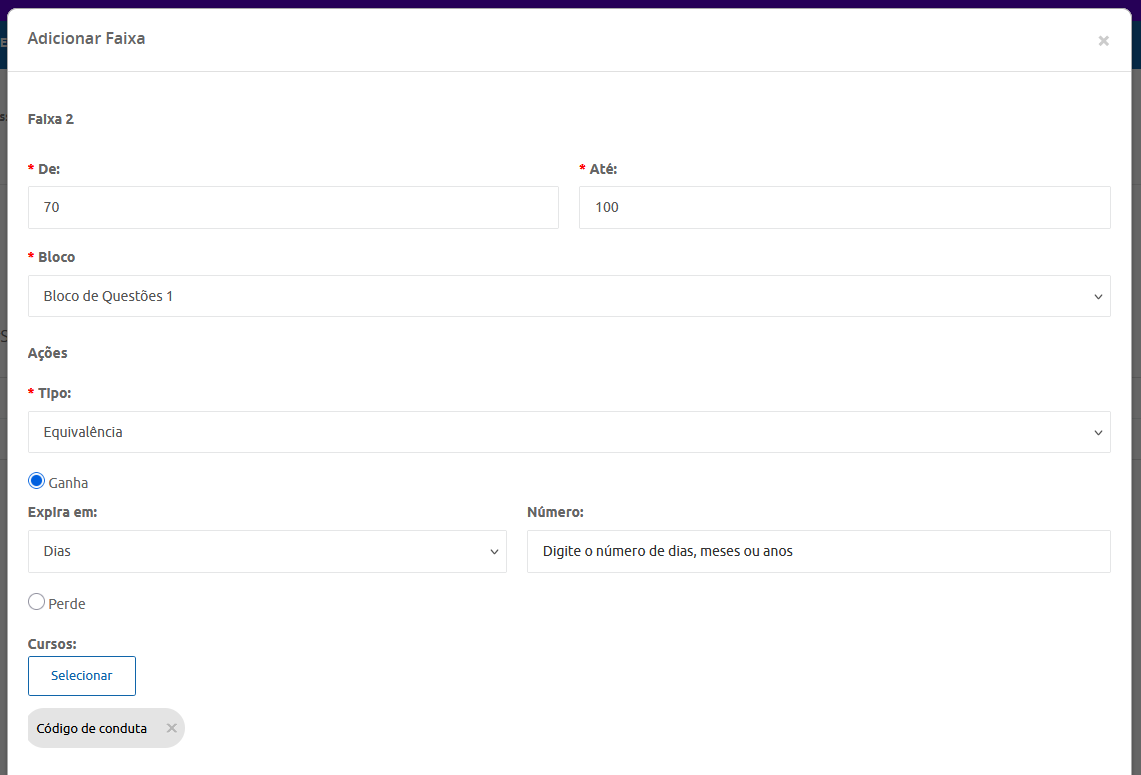 Se você selecionar que o aluno irá ganhar a equivalência, você poderá definir se essa equivalência poderá expirar também, sendo em dias, meses ou anos.Cursos: selecione o curso no qual a equivalência será aplicada.