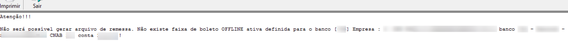 Não será possível gerar arquivo de remessa. Não existe faixa de boleto offline ativa definida para o banco XX Empresa: XX banco XX CNAB XX conta: XX !