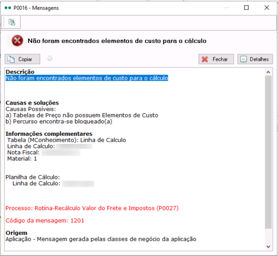 Certifique-se de que há elementos de custo configurados para atender ao tipo de operação. Exemplo: se o CT-e for de devolução, deve existir elemento de custo associado ao evento de devolução.