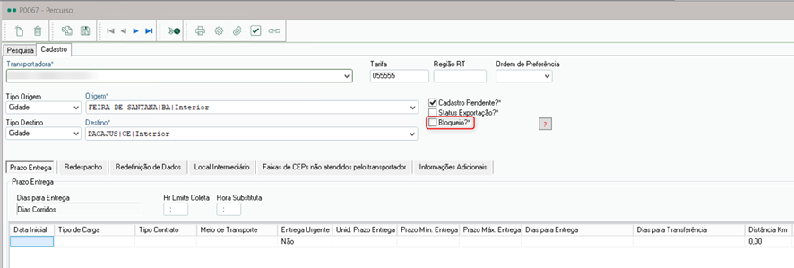 6. Acesse o menu: Exibir / Apoio / Transportadora /Percurso;