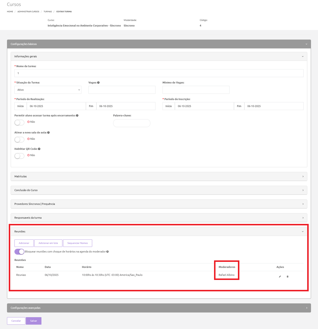 Neste outro exemplo, em um curso síncrono, o Administrador também conseguiu adicionar o usuário Rafael Albino como moderador, mesmo ele não possuindo o perfil de Moderador em seu cadastro, e sim o perfil Mediador de Aprendizagem.