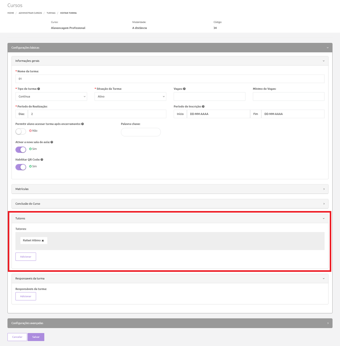 Exemplo: Nesta turma de um curso a distância, o Administrador conseguiu adicionar o usuário Rafael Albino como tutor, mesmo ele não possuindo o perfil de Tutor, e sim o perfil Mediador de Aprendizagem.