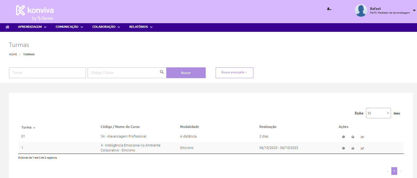 Com isso, ao acessar a plataforma com o perfil Mediador de Aprendizagem, o Rafael Albino consegue visualizar todos os cursos e turmas nas quais está associado, conforme demonstrado na imagem abaixo.
