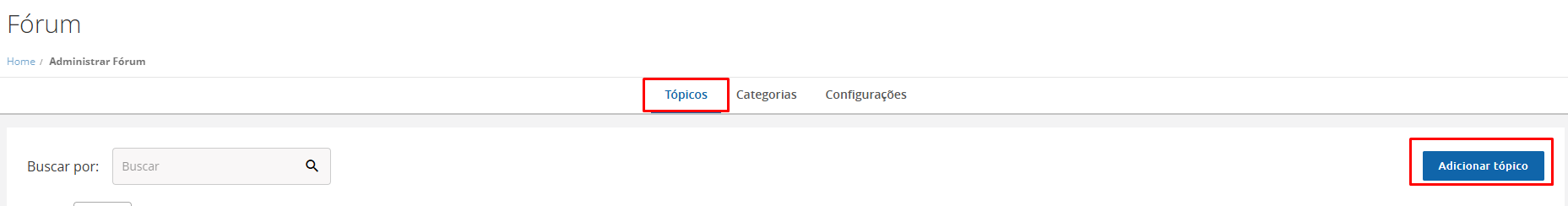 Na guia de tópicos, da tela de administração de fórum, você consegue visualizar os tópicos existentes e criar novos tópicos.