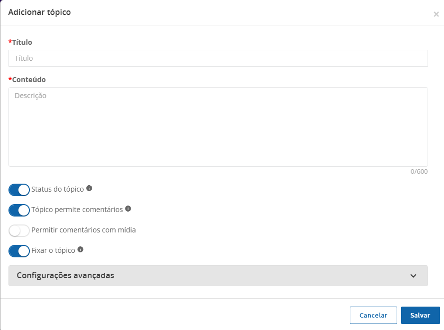 Em Configurações avançadas, você define a categoria a qual o tópico pertence. É possível adicionar mais de uma categoria ou, ainda, não adicionar categorias. Além disso, é possível segmentar a visualização do tópico por público-alvo e/ou unidades.