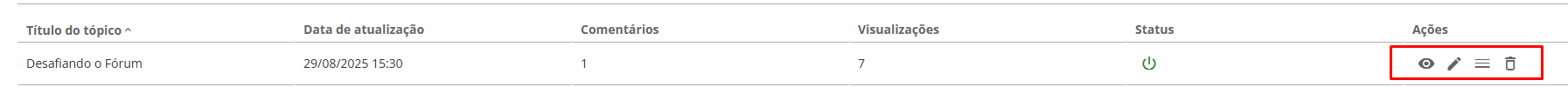 A listagem de tópicos existentes exibe o título do tópico, a data e hora da última atualização feita no tópico, a quantidade de comentários e visualizações, o status do tópico (ícone em verde para ativo, e em vermelho para inativo) e os botões de ação.