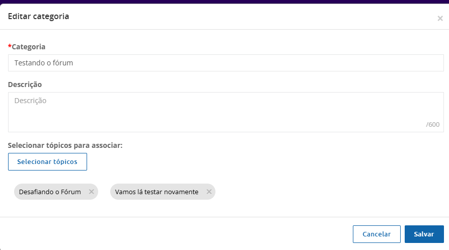 Ao adicionar uma categoria, é necessário dar um nome a ela e, caso necessário, adicionar uma descrição sobre a categoria. Em seguida, você pode adicionar os tópicos que fazem parte daquela categoria. Você pode adicionar um ou mais tópicos existentes. Por fim, basta clicar em Salvar.