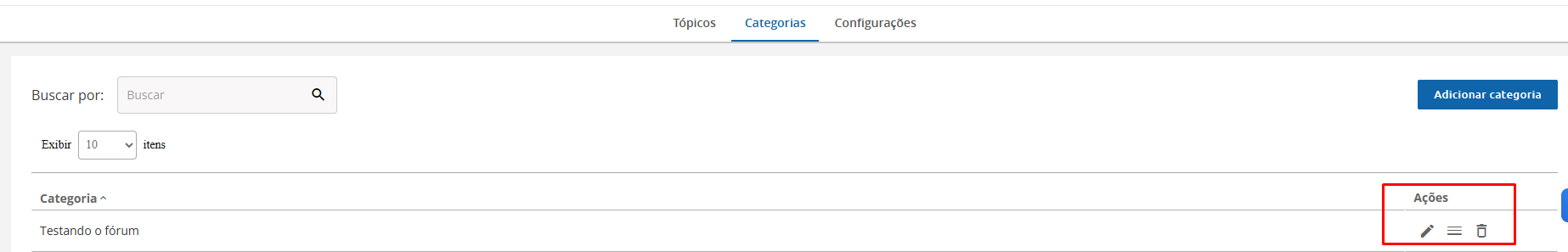 Na guia de administração de categorias, você consegue visualizar as categorias criadas. Clicando no ícone de lápis, em Editar, é possível alterar o nome, descrição e também os tópicos associados àquela categoria. Através do ícone de Associações, você consegue visualizar quais tópicos estão associados a categoria. Por fim, no ícone de Excluir, você pode excluir a categoria. Dessa maneira, todos os tópicos associados a esta categoria serão desassociados dela, mas não serão excluídos.