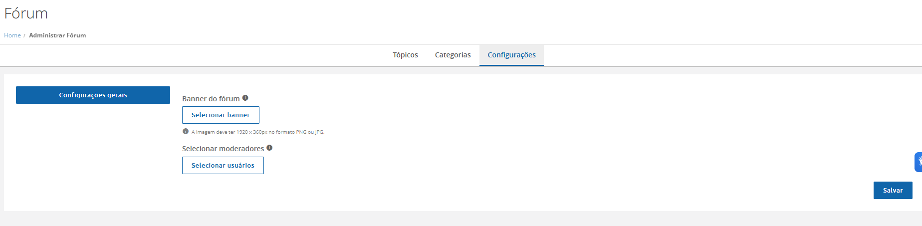 Na aba de Configurações de Fórum, o administrador consegue adicionar um Banner ao Fórum, e também selecionar os moderadores do fórum.