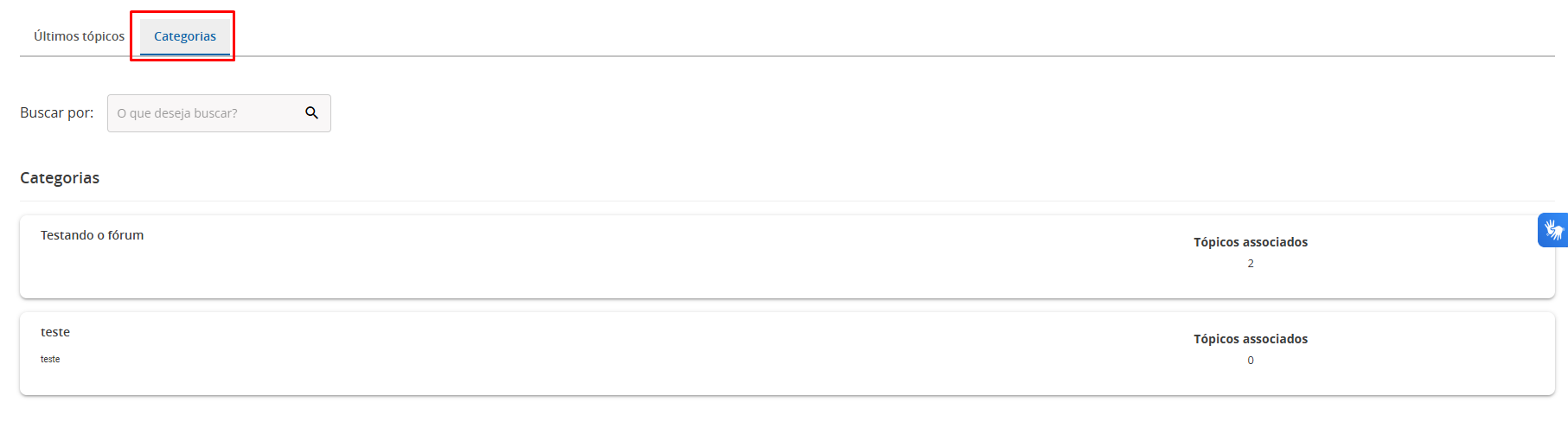 Dentro da guia de Categorias, o aluno consegue visualizar todas as categorias e a quantidade de tópicos que estão associados a essas categorias.