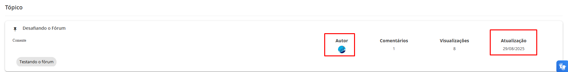 Os tópicos serão apresentados ao aluno, de forma que os primeiros sempre sejam os fixados e, em seguida, os não fixados, ordenados pela data de última atualização. Comentários e respostas não contam como atualização do tópico, portanto, a data corresponde a alterações feitas no tópico em si, como alteração no conteúdo ou título dele. Na listagem também é possível observar a foto do autor do tópico, a quantidade de comentários e visualizações, assim como a data da última atualização.