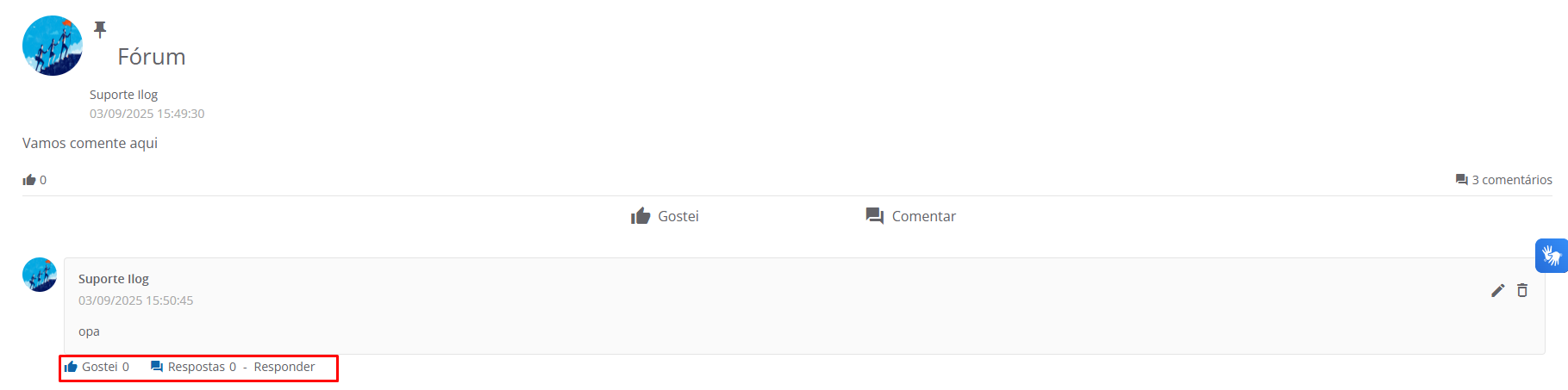Ao clicar no ícone de Acessar tópico, você consegue visualizar como aquele tópico fica na visão do aluno. Consegue ainda realizar ações como curtir, comentar e responder ao tópico. É através da visualização que você consegue administrar os comentários e respostas dos alunos, ocultando ou excluindo, caso necessário.