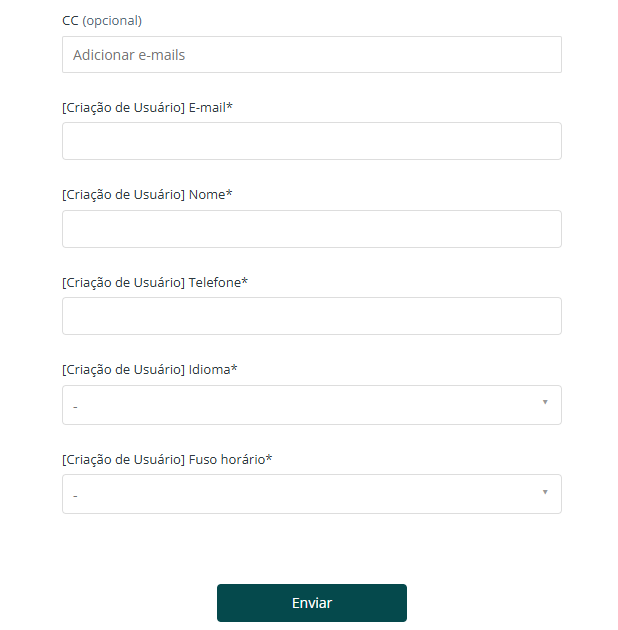 CC (opcional): Informe, se desejar, um endereço de e-mail previamente cadastrado como Solicitante, que receberá em cópia o retorno da criação deste usuário;