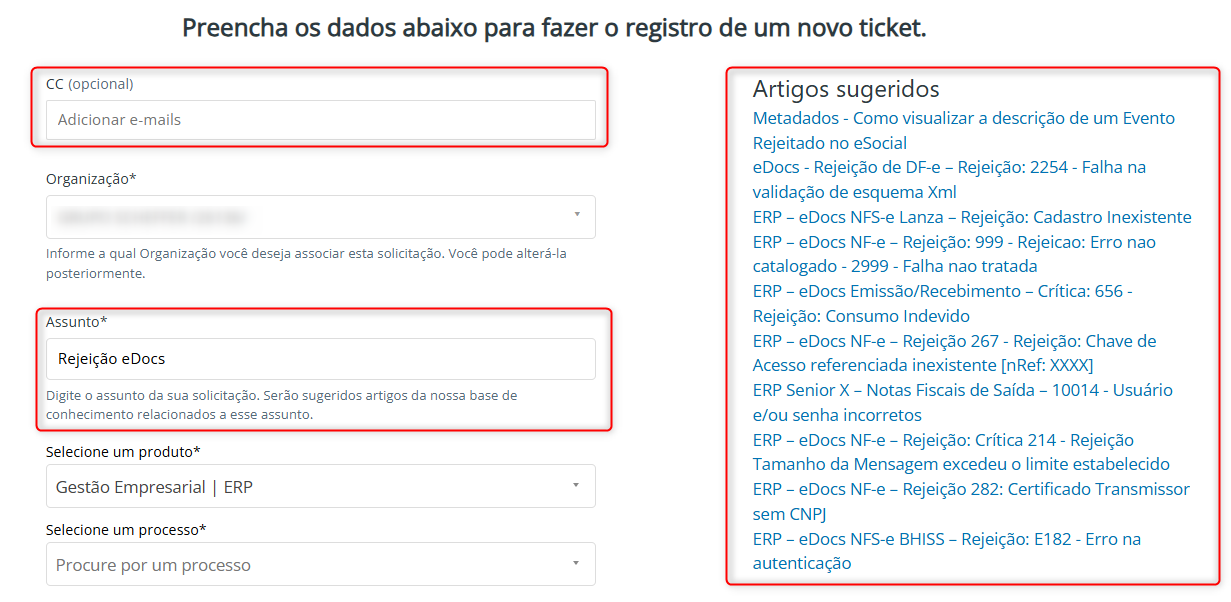 Importante: A Plataforma de Atendimento Zendesk permitirá a abertura de tickets apenas para o Produto, Processo, Módulo que estiverem registrados em contrato do cliente logado ou selecionado.