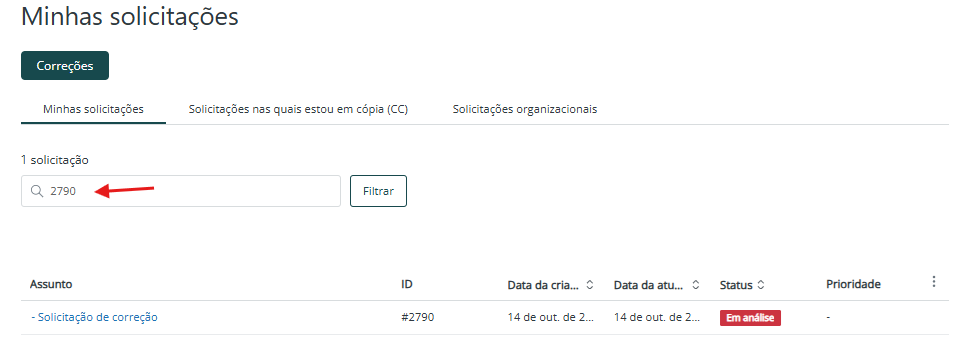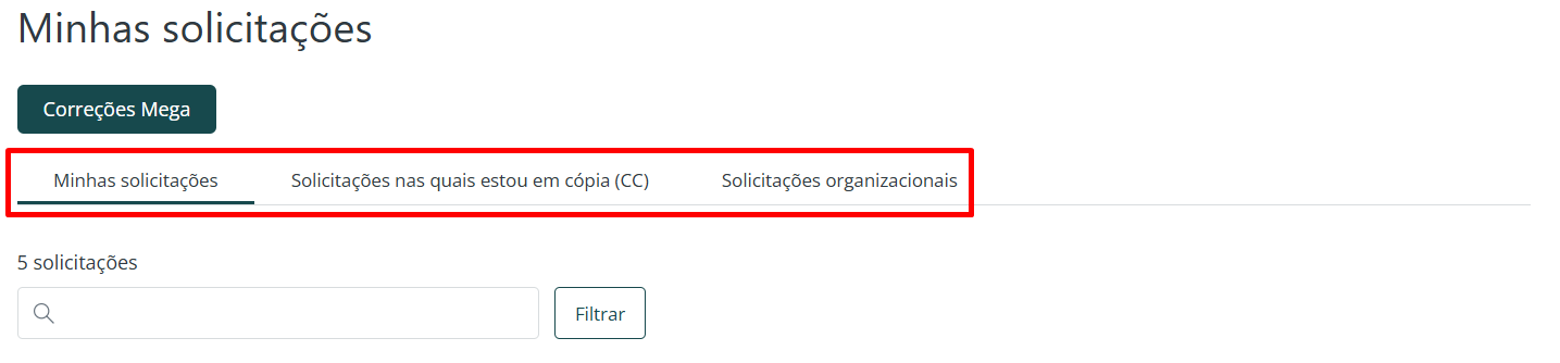 5. A tela Minhas solicitações será exibida e nela há três abas principais: Minhas Solicitações, Solicitações nas quais estou em cópia e Solicitações organizacionais: