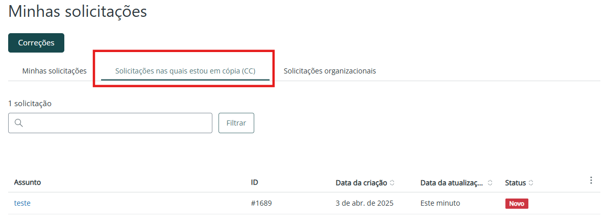 4. Na tela de Minhas Solicitações, clique na aba Solicitações nas quais estou em cópia (CC), conforme imagem abaixo: