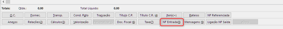 4. Selecione o registro da Nota Fiscal e acione o botão NF Entrada no rodapé da tela, conforme imagem abaixo. Isso fará com que a tela F440GNE_SRNF - Suprimentos / Gestão de Recebimento / Notas Fiscais de Entrada / Agrupada seja aberta com os dados da NF já carregados.