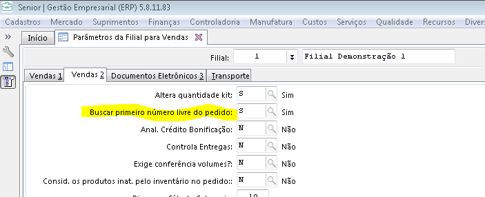 3. Selecione 'S' no campo Buscar primeiro número livre do pedido, conforme demonstrado na imagem abaixo:
