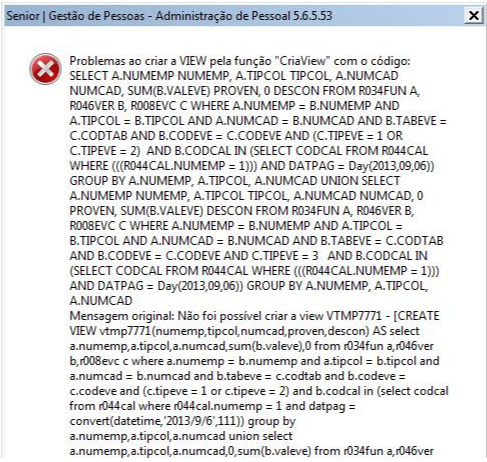 Problemas ao criar a VIEW pela função CriaView com o código: SELECT A.NUMEMP NUMEMP, A.TIPCOL TIPCOL, A.NUMCAD NUMCAD... Não foi possível criar a view VTMP7771.