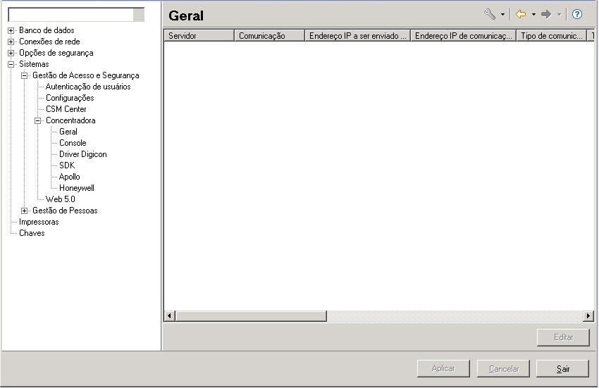 Solução: O sistema busca informação sobre a Concentradora no arquivo INST.CTRL, e caso não encontre, não mostrará a linha da Concentradora no caminho Sistemas > Gestão de Acesso e Segurança > Concentradora > Geral. Neste caso, a Concentradora deve ser reinstalada utilizando o SeniorInstaller.
