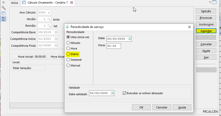 Para isso, no menu Orçamento > Cenário > Cálculo, deve ser configurado para executar o cálculo do orçamento de forma assíncrona através do botão Agendar, conforme exemplo abaixo: