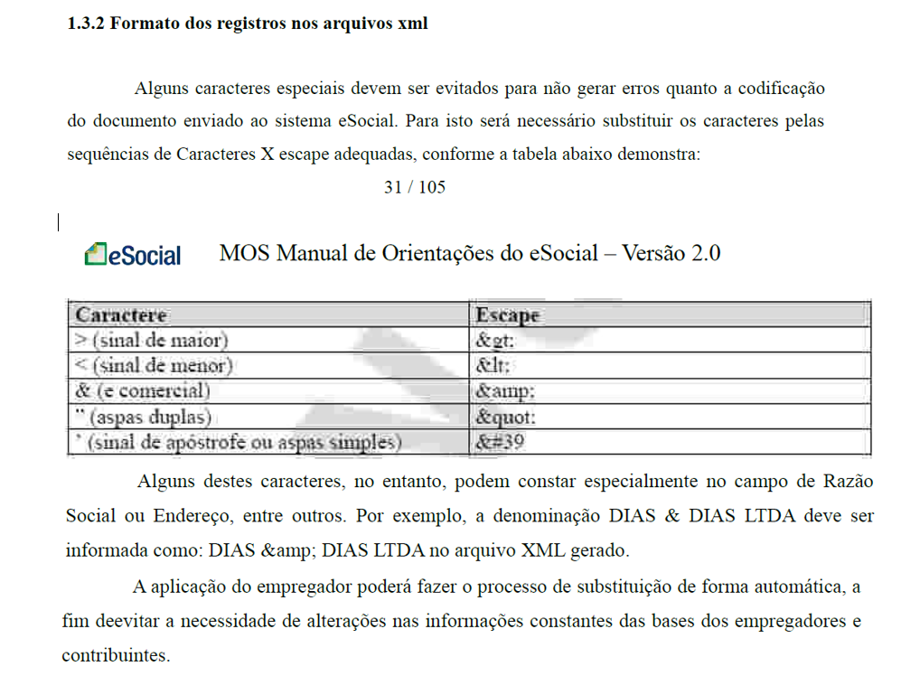 Problema: Na geração dos arquivos XML, gostaríamos de saber se o programa da Senior fará a substituição automática dos caracteres especiais. De acordo com a orientação que consta no print abaixo do manual do eSocial, alguns caracteres especiais devem ser evitados para não gerar erros quanto a codificação do documento enviado ao eSocial. Para isto será necessário substituir os caracteres pelas sequências de caracteres x escape adequadas, conforme a tabela do item 1.3.2.