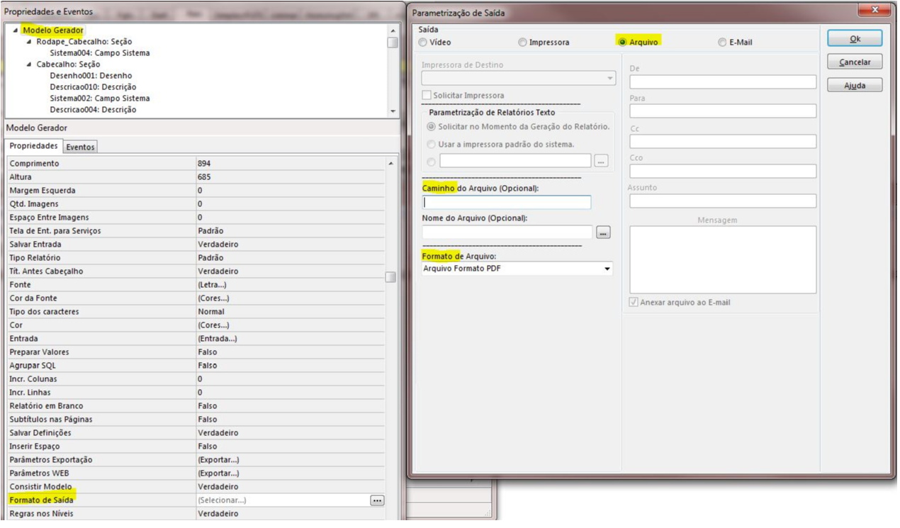 Solução: Através do Gerador de Relatórios, na seção Modelo Gerador, temos a propriedade Formato de Saída, onde é possível configurar um caminho para salvar o relatório e também o formato de saída do mesmo: