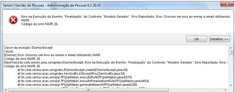 Erro na execução do evento: Finalização do controle: Modelo gerador. Erro Reportado. Erro: Ocorreu um erro ao enviar o email atualizando MAPI. Código do erro MAPI: 26: