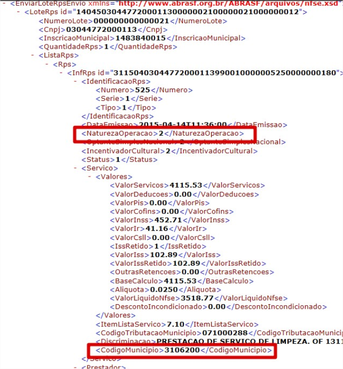 Veja que a tag <NaturezaOperacao> foi gerado com o valor 2, ou seja, tributado fora do município conforme parametrizado na transação (tela F001TDV, campo 'Natureza operação do serviço' da aba 'Dados gerais') ou via identificador de regras GER-000ABRASF1. variável VSIntNatOpe