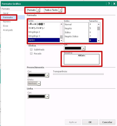 3) Selecionar a guia Formato, marcar as caixas de seleção Formato e Todo o Texto, escolher qual a fonte, estilo e tamanho desejados. Observação o campo Amostra.