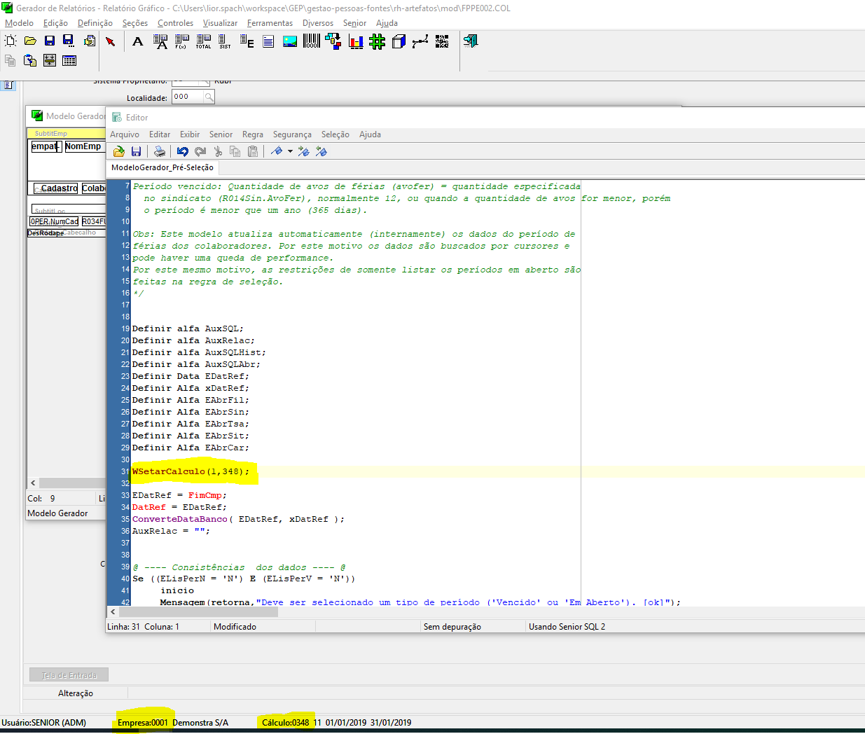 Lembrando que é necessário substituir ''EmpAti' e 'CalAti' pela empresa e cálculo desejado, respectivamente, como mostrado no print. Tem que tomar cuidado pois se apenas incluir WSetarCalculo(EmpAti,CalAti), o relatorio ainda vai compilar mas não vai gerar informações devido as variaveis EmpAti e CalAti estarem vazias no processo automático.