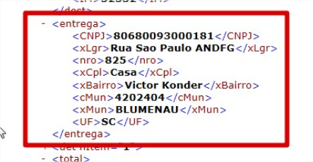 Solução: Solução 15884: Essa rejeição ocorre quando não é gerado no XML as informações de entrega, referente as tags destacadas abaixo.