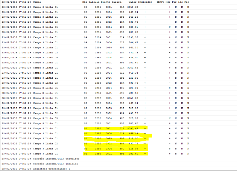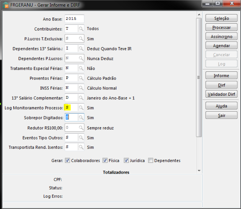 Estes valores podem ser verificados para conferência pelo log da geração da Dirf. Para isso, ao gerar a Dirf deve informar S no campo Log Monitoramento Processo (ressaltamos que é possível gerar este log somente com abrangência de um colaborador):