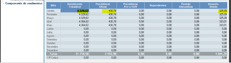 Neste caso, para conferência, deve-se somar os valores com sinal + de acordo com o mês (observado na primeira coluna) e diminuir os eventos com sinal -: