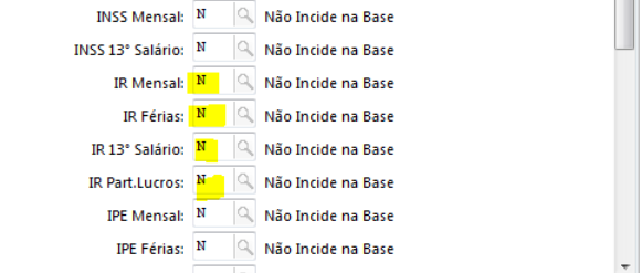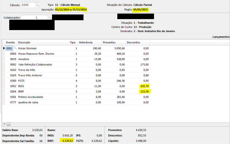 Observa-se no rodapé a base de IRRF no valor de 4329,62. Este valor é composto de todos os eventos com tributação positiva para IRRF (isto pode ser verificado no cadastro dos eventos, em: tabelas > eventos > eventos > cadastro, guia incidências)