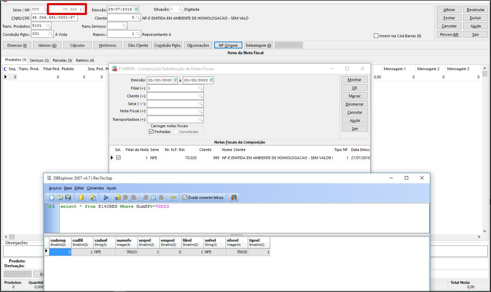 Solução: Solução 17091: Não existe atualmente tela de consulta para verificar a NF relacionada em relação as NF de acerto. Se o cliente desejar, poderá desenvolver um relatório para listar essas informações, que são gravadas na tabela E140REN conforme exemplo abaixo.