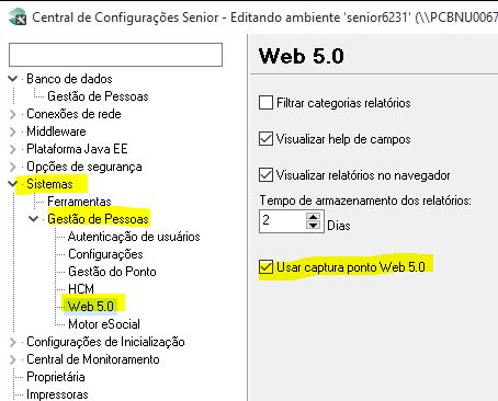 Solução: No SeniorConfigCenter, item Sistemas > Gestão de Pessoas > Web 5.0, marcar o campo Usar captura ponto Web 5.0 vide abaixo: